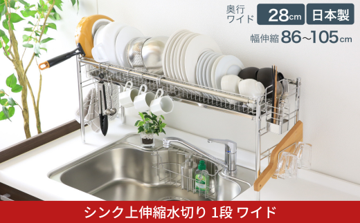 シンク上伸縮水切り1段ワイド 水切り 水切りかご 水切りカゴ 水切り籠 水切りバスケット オールステンレス 大容量 シンク上 シンクサイド ディッシュラック 燕三条製 [川口工器] 【057S010】