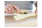 まな板の上に長ねぎを置き、ステンレスのギザ刃で葉の方向から根元へ向かって引くことで白髪ねぎができます。