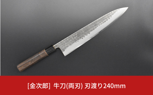 [金次郎] 牛刀(両刃) 刃渡り240mm 左利き・右利き使用可 槌目仕上げ 鋼 ステンレス 燕三条製 贈答用 ギフト 紙箱入り 【120S001】