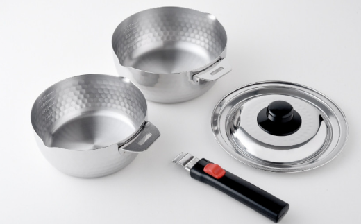 新潟県燕三条地区の職人が丁寧に仕上げた、雪平鍋18cm、16cmの2サイズと蓋、取り外し可能なハンドルの4点セットです。