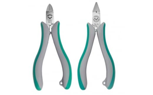 ①TM-02 Trinity 薄刃ニッパー 120mm 寸法:119×52mm 重量:60g 材質:特殊合金鋼(本体)、エラストマー(グリップ) 切断能力:プラスチックΦ3.0mm ②TM-15 Trinity 先細ニッパー 120mm 寸法:121×52mm 重量:65g 材質: 特殊合金鋼(本体)、エラストマー(グリップ) 切断能力:プラスチックΦ2.5mm、銅線Φ1.0mm 軟鉄線(針金)Φ0.5mm、より線1.25mm² |