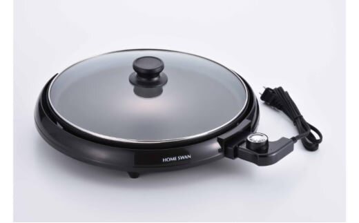 直径33cmのホットプレート。一度にたくさん焼くことができます。フッ素樹脂塗装でこびり付きにくい。中身の見えるガラスふた付。保温~230℃までの温度調節器付。コードの長さ約1.4m。
