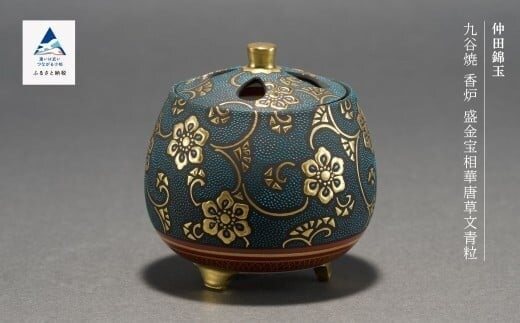 九谷焼「香炉 盛金宝相華唐草文青粒」 仲田錦玉