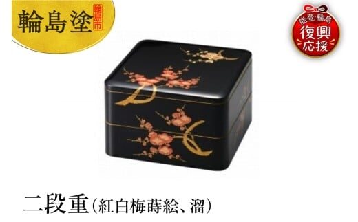 輪島塗 二段重(紅白梅蒔絵、溜)