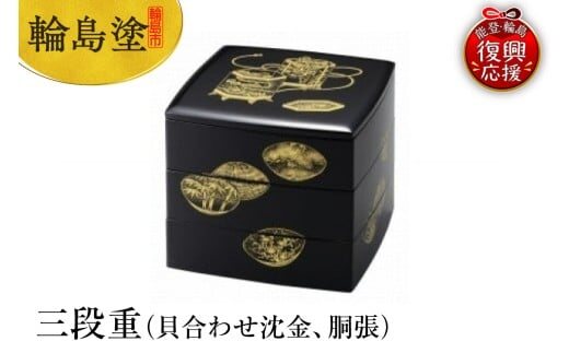 輪島塗 三段重(貝合わせ沈金、胴張)