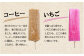 いちご:砂糖、乳製品、香料、着色料|レモン:砂糖、乳製品、香料、着色料|あずき:砂糖、あずき、デンプン|コーヒー:砂糖、乳製品、コーヒー、デンプン|ミルク:砂糖、乳製品、卵、香料