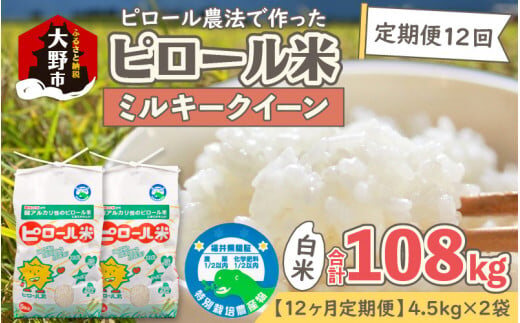 【令和7年産 新米】【12ヶ月定期便】ミネラル豊富!弱アルカリ性のピロール米 ミルキークイーン 白米 9kg(4.5kg×2袋) ×12回 計108kg 化学肥料5割以下・減農薬