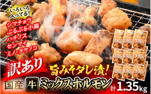 【訳あり】国産牛 ミックスホルモン 計1350g(150g × 9袋)シマチョウ・小腸・ハチノス・センマイ・ミノ・タケノコ 旨みそダレ漬!【12月発送】【お手軽 冷凍 小分け BBQ バーベキュー】 [e03-a034_12]