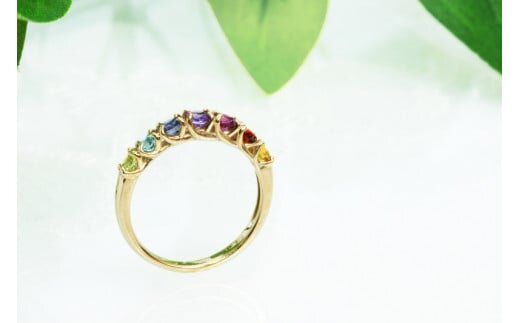 柔らかい曲線で包み込むようなデザインの石枠に幸運を招く七色をセッティングしました。程よい透かしが光を取り込み色鮮やかに輝きます。