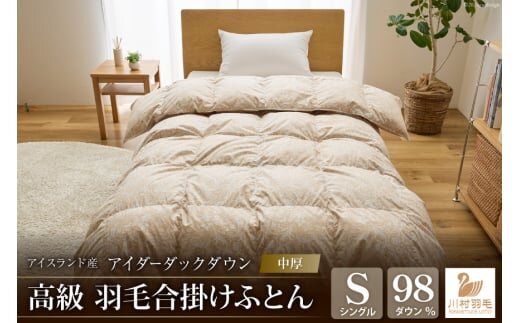 【中厚】アイダーダウン 最高級 軽量 羽毛布団 シングル 合掛け 羽毛 布団 アイスランド産 アイダーダックダウン 98% 0.6kg 掛け布団 春用 秋用 ゴールドベージュ 柄 100x140番手サテン 日本製 綿100% ダウンケット 合掛け布団 ダウンかけ布団 ふとん 羽毛ふとん 寝具 合い掛け [川村羽毛 山梨県 韮崎市 20743048]