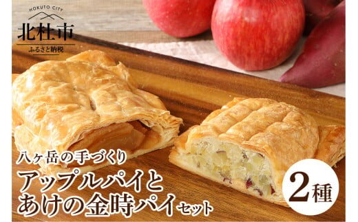 国産ふじりんごをふんだんに使ってシナモンを練り込んだ香り豊かな手作りのアップルパイと、北杜市明野産の甘みの強いあけの金時芋をたっぷり使用した金時パイのセットです。