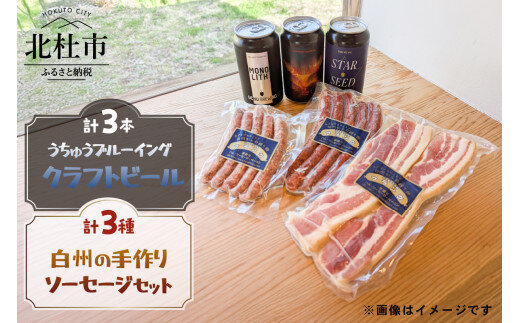 うちゅうブルーイング クラフトビール3本と名水百選で知られる白州の手作りソーセージ3種セット クラフトビール ソーセージ ウインナー ベーコン 詰め合わせ セット 3本 350ml 宇宙ビール うちゅうブルーイング シポラタウインナー チョリソーソーセージ ソフトベーコン 食べ比べ 飲み比べ