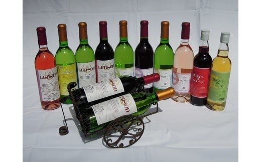 【フルセット計12本】 ・白ワイン(720ml):中口1本、辛口5本 ・赤ワイン(720ml):フルボディ1本、ミディアム3本 ・ロゼワイン(720ml):辛口2本 ・果汁(550ml):白1本、赤1本 |