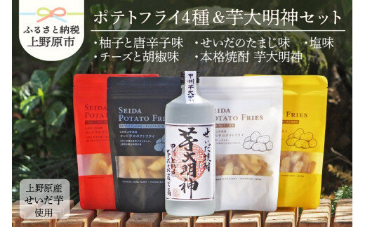 山梨県上野原産 『本格焼酎 芋大明神』1本+『せいだ芋のポテトフライ』4点セット 焼酎 芋焼酎 ポテトフライ ポテトスナック 菓子 芋 せいだ芋 セット ギフト プレゼント 贈り物 お土産 フルーティー 送料無料 山梨県 上野原市