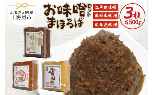 金紋江戸甘味噌500g×1、金紋雪日出味噌500g×1、金紋まる豆味噌500g×1のお味噌詰合せのギフトセットです。
