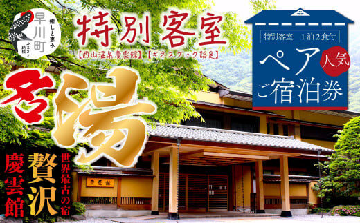 【西山温泉慶雲館】特別客室 1泊2食付ペア宿泊券 源泉100%掛け流しの温泉で贅沢なひとときを |