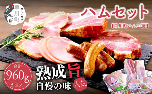 ロースハム(スライス) 約75g 各2個 ポークソーセージ(ウインナー) 約120g 各2個 ステーキベーコン(ブロック) 約200g 各2個 ロースベーコン(スライス) 約80g 各1個 ショルダーベーコン(スライス) 約90g 各1個 合計 960g |