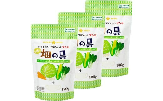 ■お礼品の内容について ・ひかり味噌 畑の具 3袋 ・3袋(1袋190g) ・製造地:長野県茅野市 |