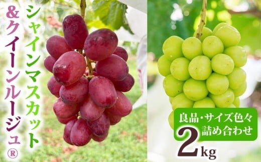 シャインマスカット2房、クイーンルージュ(R)2房 合計4房、約2kg ※房の大きさが様々な詰め合わせとなります。 |