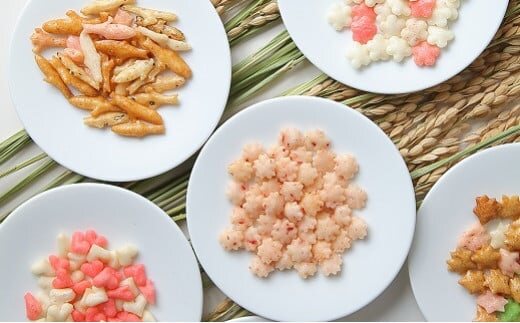 姿あられは日本の四季の移ろいをイメージして作られており、それぞれ味・形が異なります。
