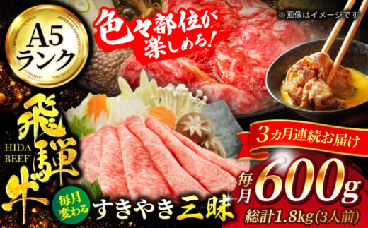 【3回定期便】A5ランク 飛騨牛 すきやき三昧( 3人前)1回あたり600g 総計1,800g【有限会社マルゴー】牛肉 和牛 国産 [MBE064]