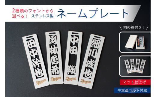 ステンレス製ネームプレート 牛本革ベルト付属 マット仕上げ(桐の箱付き) 和風角文字【中日ドラゴンズコラボ】【 岐阜県 可児市 選べる デザインフォント 頑丈 錆に強い サンドブラスト加工 キーホルダー ギフト 雑貨 シンプル 】