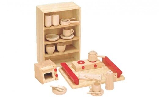 『ごっこあそび』の原点。ブナの良材を使ったオーセンティックなままごとあそびセットです。手ざわりがやさしく木の温もりが伝わります。収納箱が食器棚に、ふたがトレイになります。