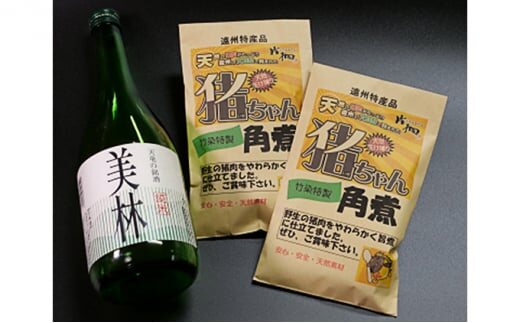 容量 | 天然獣肉(ジビエ)の角煮“猪ちゃん”(130g×2袋)と天竜川水系の水で仕込んだ花の舞酒造で醸した純米酒”美林”(720ml×1本)の詰め合わせ |