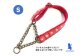 ハーフチョークカラーはワンちゃんが引っ張った時だけ首のサイズと同じに締まります。首以上に締まらないので苦しくありません。ゆるい時は抜けない構造です。引いた時にハーフチョークチェーンの締まる振動と少しの音でワンちゃんが飼い主さんに注意を向けてくれます。飼い主さんの気持ちが伝わりやすい首輪です。持ち手にバックルを付けました。ドッグカフェなどでチェーンは日本製でオリジナル、とても丈夫で安心です。ワンちゃんの首周りを基準に前後数センチの調節が可能です。成長期のワンちゃんは生後何か月なのかも教えてください。首周りも直接お電話で教えて下されば成長分を踏まえて制作いたします。