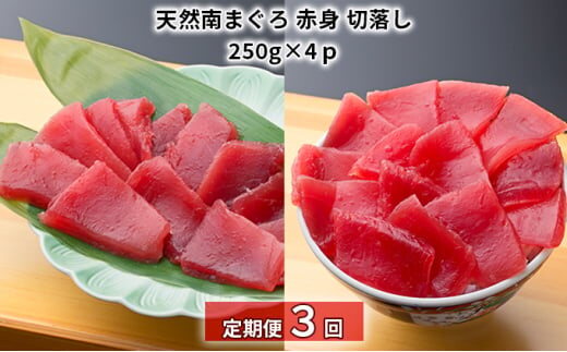 【定期便 3回】※月1回、3ヶ月連続でお届けします。 天然南まぐろ赤身切落し 産地 台湾 250g×4パック 計1kg 加工地:浜松市 ※到着後、冷凍7日、解凍後2日 |
