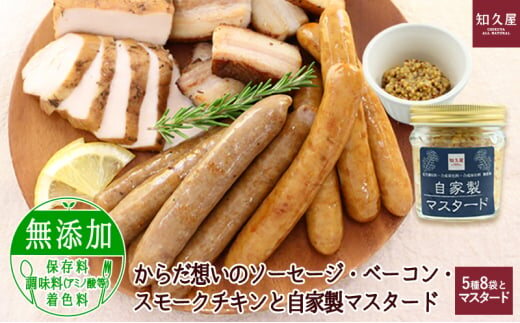 手作りのおいしさ! からだ想いのソーセージ・ベーコン・スモークチキンと自家製マスタード(5種8袋とマスタード)知久屋[ちくや]【配送不可:離島】[№5786-5441]