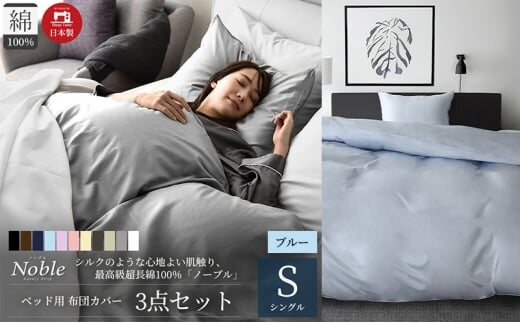 超長綿100% シルクのような艶「ノーブル」 ベッド用布団カバー 3点セット シングルサイズ ブルー [№5786-5620]