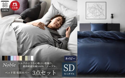 超長綿100% シルクのような艶「ノーブル」 ベッド用布団カバー 3点セット セミダブルサイズ ネイビー [№5786-5629]