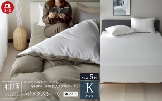 綿100% 和晒製法ダブルガーゼ ボックスシーツ キングサイズ ホワイト 「和晒」 [№5786-5699]