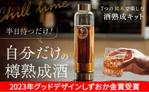 焼き上げ(チャー)した7つの国産銘木を選んでボトルにセットし、いつものお酒を注いだら準備はOK。わずか半日で、樽熟成酒が楽しめます!