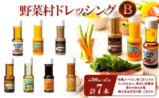 野菜村ドレッシングB(和風スパイス、Wごまミックス、三ヶ日みかん、香ばしW醤油、深みのあるお塩、刻み玉ねぎぽん酢、ごまだれ)各300ml 各1本 計7本 セット 静岡 浜松市[№5360-0204]