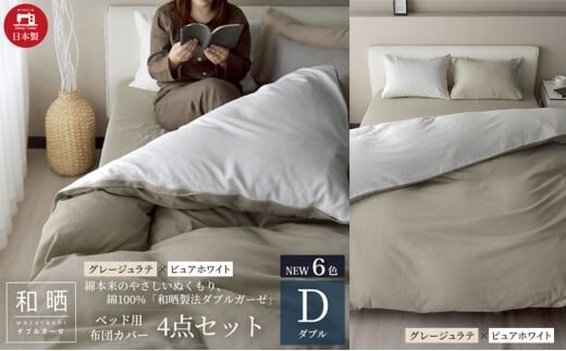 綿100% 和晒製法ダブルガーゼ ベッド用 布団カバー 4点セット ダブルサイズ グレージュラテ×ピュアホワイト 静岡 浜松市 [№5360-0435]