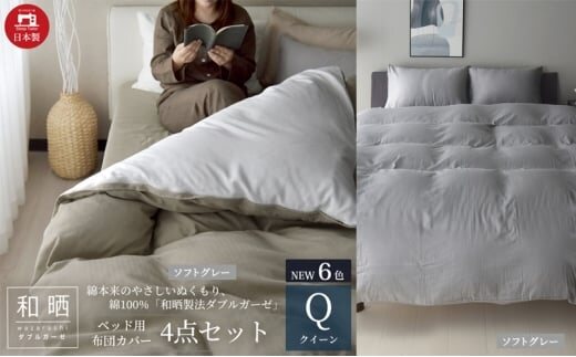 綿100% 和晒製法ダブルガーゼ ベッド用 布団カバー 4点セット クイーンサイズ ソフトグレー 静岡 浜松市 [№5360-0438]