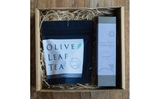 磐田市産100%のエキストラバージン・オリーブオイルと、オリーブリーフティーをセットにしてお届けします。