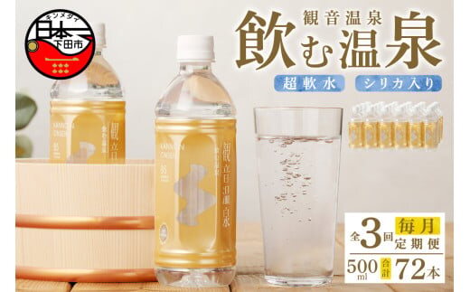 <観音温泉>飲む温泉 観音温泉 500ml (24本入) 1ケース 定期便 3ヶ月 毎月 [水 500ml 温泉水 飲む温泉水 24本 1ケース 国産 超軟水 美容 健康 料理 シリカ 飲むシリカ ミネラルウォーター 常温保存 備蓄 保存水 静岡 伊豆 下田市]
