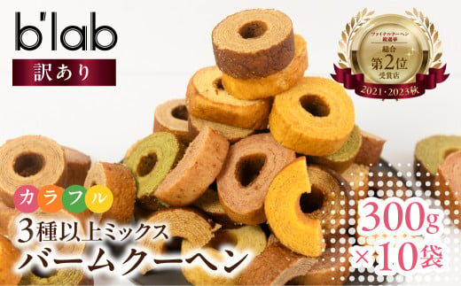 b'labバームクーヘン (300g)×10袋 ※味はおまかせください。(3種以上のミックスとなります。) ちょっとでも形が崩れてしまった、少しサイズが足りなかったなどの理由があって販売できなかったバームクーヘンを 大袋に詰めアウトレットとして販売しております。 |