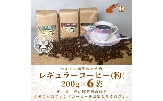 【レギュラーコーヒー(粉)】セルビア珈琲の本格的なコーヒー豆の詰め合せ。 200g×6クラフト袋入
