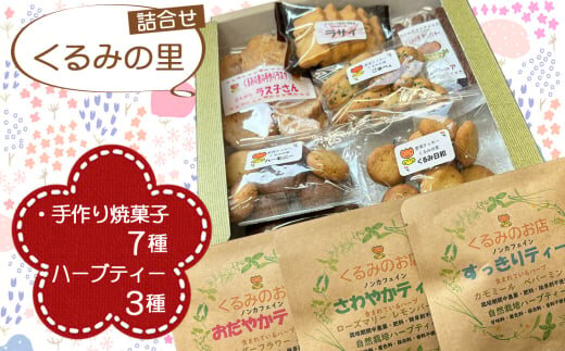 くるみの里手作りの焼菓子7種類と、栽培期間中農薬・肥料・除草剤不使用の国産ハーブを使用したくるみのお店オリジナルハーブティー3種類をお送り致します。