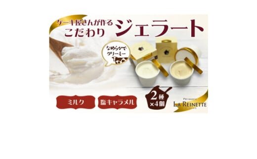 愛知県豊明市で製造されたリッチミルクジェラートと塩キャラメルジェラートのセットです。それぞれ90ml×4個、計8個を楽しむことができます。