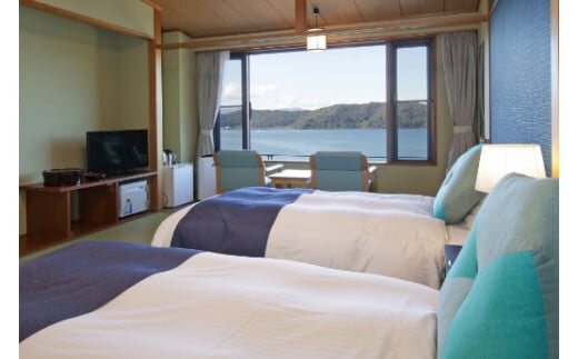 客室からは琵琶湖をはじめ、沖島や対岸の高島まで見渡せ、温泉「宮ヶ浜の湯」でおくつろぎいただけます。