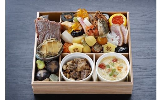 生産牧場にまでこだわった近江八幡市田中牧場産A4等級以上使用の近江牛ローストビーフ(かたまり)に、近江牛の煮込み料理を二品と琵琶湖産子持ち鮎甘露煮や滋賀の銘酒【七本槍】を使用した鱈艶煮・近江八幡産野菜の数々・琵琶湖からすま蓮根と近江八幡産小豆の従妹煮など、湖国の豊かな恵をお重一杯に詰めさせて頂きました。