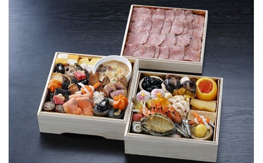 生産牧場にまでこだわった近江八幡市田中牧場産近江牛ローストビーフを始め、近江牛三枚肉ココット煮込みや琵琶湖産子持ち鮎甘露煮・琵琶湖産諸子南蛮漬け・滋賀の銘酒【七本槍】を使用したあわび酒蒸し・近江八幡産野菜の数々・琵琶湖からすま蓮根と近江八幡産小豆の従妹煮など、湖国の恵をお重一杯に詰めさせて頂きました。