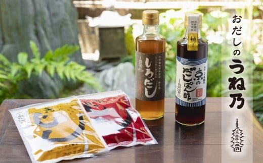 ぽん酢に定番のおだしのパックじん、しろだしのセットです。色々なお料理にお使いいただけます。