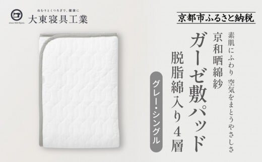 【大東寝具】~オールシーズン快適に使える敷パッド~ 京和晒綿紗 ガーゼ敷パッド(脱脂綿入り)4層(グレー・シングル)[ 京都 寝具 老舗 敷パッド ふとん 人気 おすすめ 快眠 寝ごこち 睡眠 健康 お取り寄せ 通販 送料無料 ふるさと納税 ]