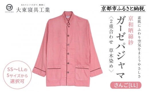 【大東寝具】京和晒綿紗 ガーゼパジャマ 2重合わせ 草木染め≪さんご≫ LLサイズ(男女兼用)[ 京都 寝具 老舗 パジャマ 人気 おすすめ ガーゼ 快眠 健康 やわらかい お取り寄せ 通販 送料無料 ふるさと納税 ]